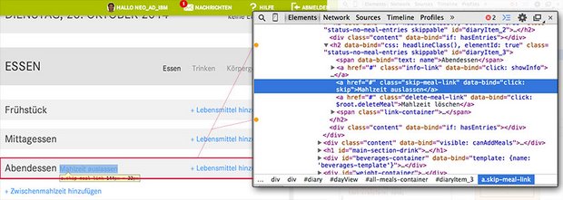 Wie sich bei näherer Betrachtung herausstellte, lag auf dem Element eine CSS Deklaration, welche bei :hover ein weiteres, zuvor verstecktes Element (die Funktion „Mahlzeit auslassen“), einblendet. Ein Effekt also, der einem Ausklappmenü oder Dropdown ähnelt. Trotz einiger Usability-Probleme, die das Anzeigen von Informationen beim Darüberfahren mit sich bringt, ist dieses Vorgehen jedoch weit verbreitet.